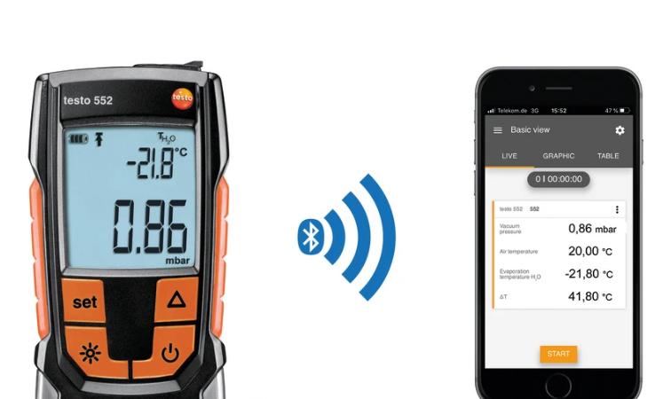通过蓝牙接口,testo 552与智能设备(手机或平板电脑)上的 testo Smart APP 智能应用程序连接。可以让您便捷地在智能设备上读取测量数据,在现场完成和发送测量报告。